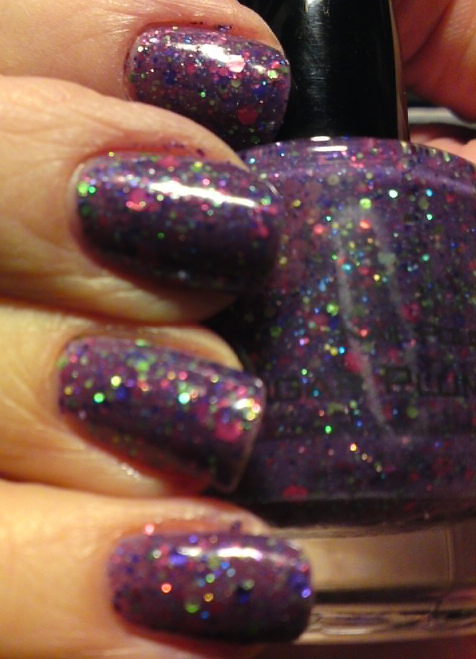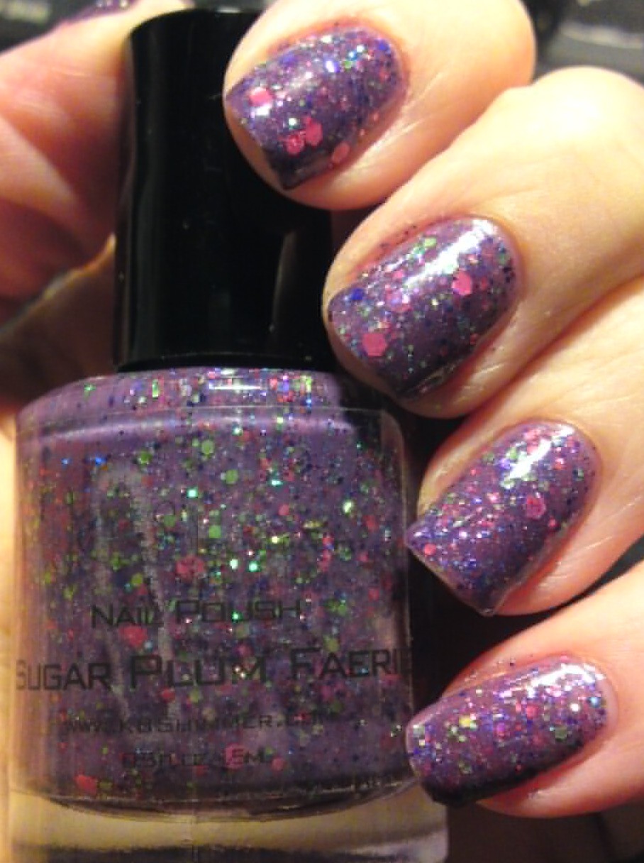 My bestie-I've-never-met Debbie of the one and only Crumpet go here and like has been doing a 30 Days of Purple and in her honor I've decided to try the one purple I think I can wear for a few days, KBShimmer Sugar Plum Faerie. Probably because it has green in it, both holo and shiny lime green hexes in a couple shades and sizes, added to a soft murky light purple crelly base loaded with many sizes and shades of purple and pink glitters. I have to say, though, this really is an astonishingly complicated and beautiful polish, part of her Winter (Holiday) 2012 collection, available on her site here. I think this makes a total of maybe 12? of Christy's polishes I now own, each one special and wonderful. I used three thin coats, no shoving or placing of glitters, then Gelous and HKGirl topcoat. Purple. Yeah.